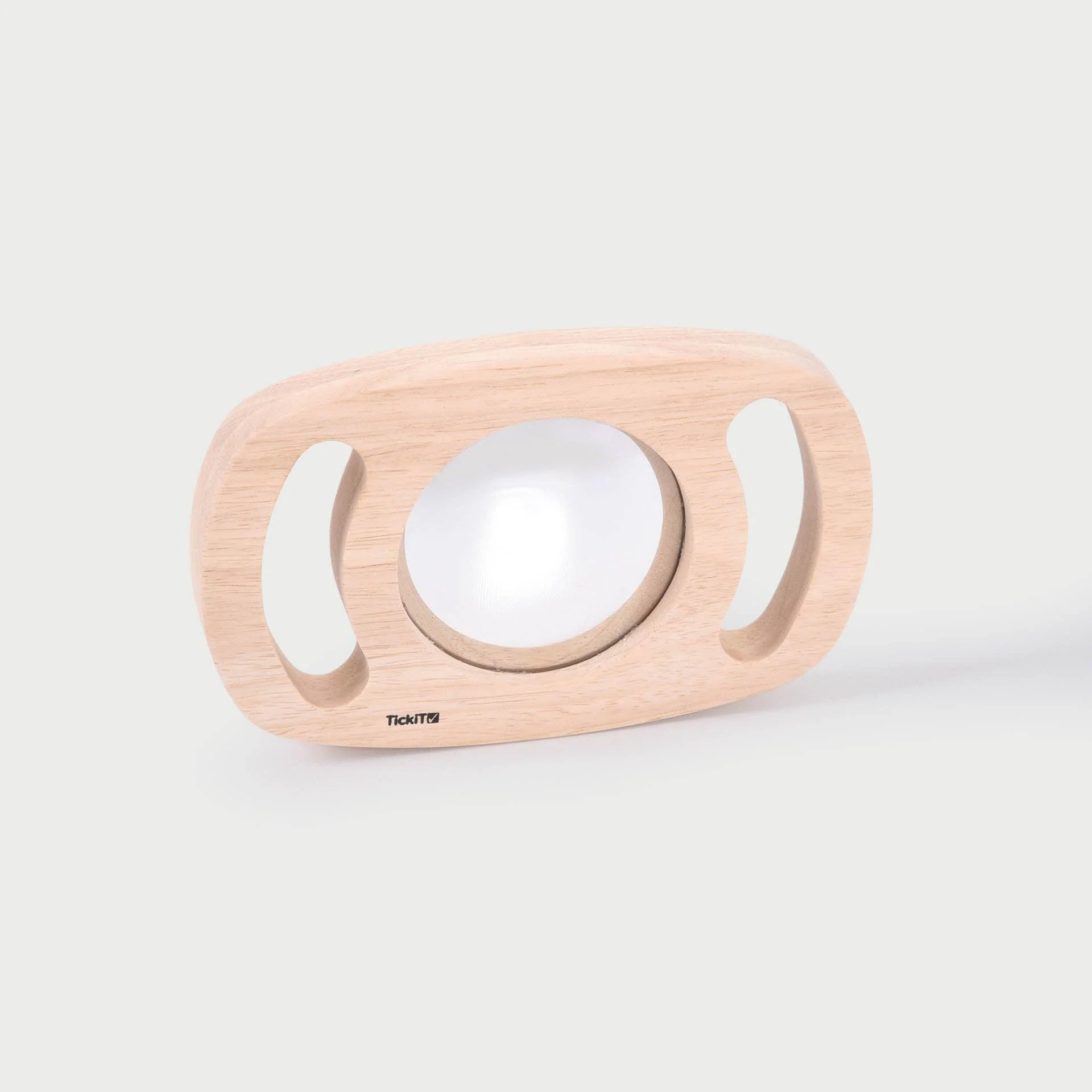 De TickiT Easy Hold Convex/Concave Mirror is een uniek houten kijkpaneel met een dubbelzijdige spiegel die kinderen uitnodigt om de wereld op een heel nieuwe manier te ontdekken. Het stevige rubberhouten frame met handvatten maakt het eenvoudig vast te houden, zelfs voor kleine handjes. Wanneer kinderen het paneel bewegen of kantelen, zien ze vervormde beelden: groter, kleiner, omgekeerd of bol vervormd. Dit wekt verwondering, stimuleert observatie en moedigt taalontwikkeling aan.