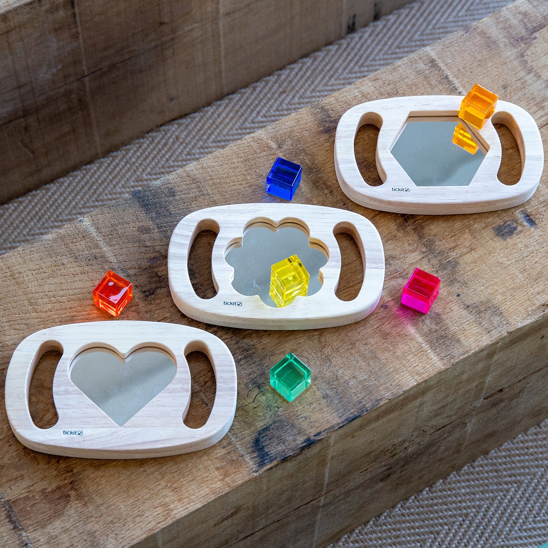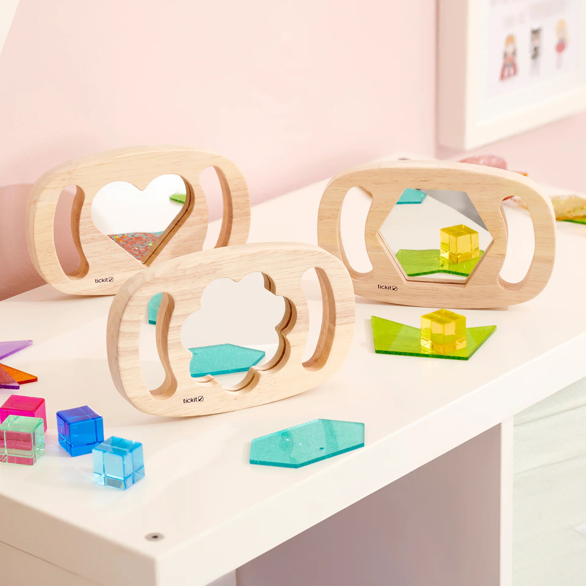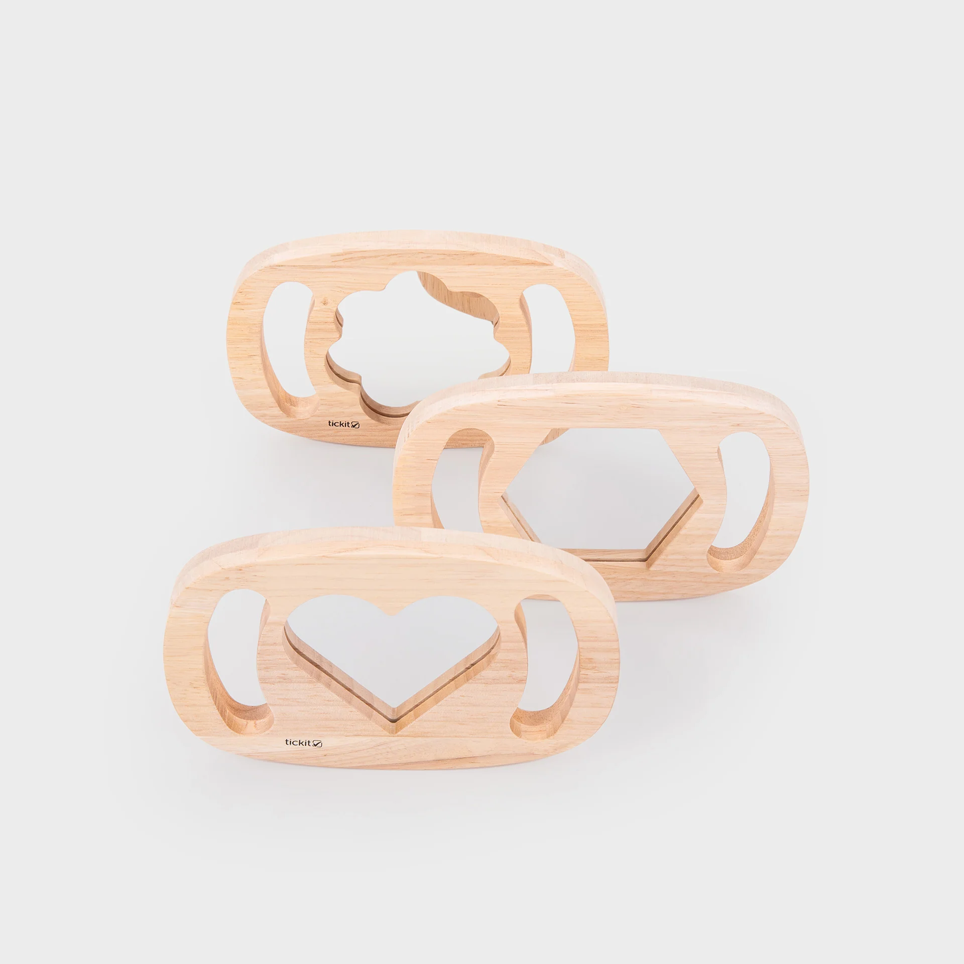 De TickiT Wooden Shape Viewer Panels combineren speels design met zintuiglijke ontdekking. Elk stevig houten frame bevat een acrylspiegel in een leuke vorm—hexagon, hart of bloem—perfect afgestemd op kleine handjes. Kinderen kunnen hun eigen reflectie ontdekken, experimenteren met rollen en fantasievol spel beleven.