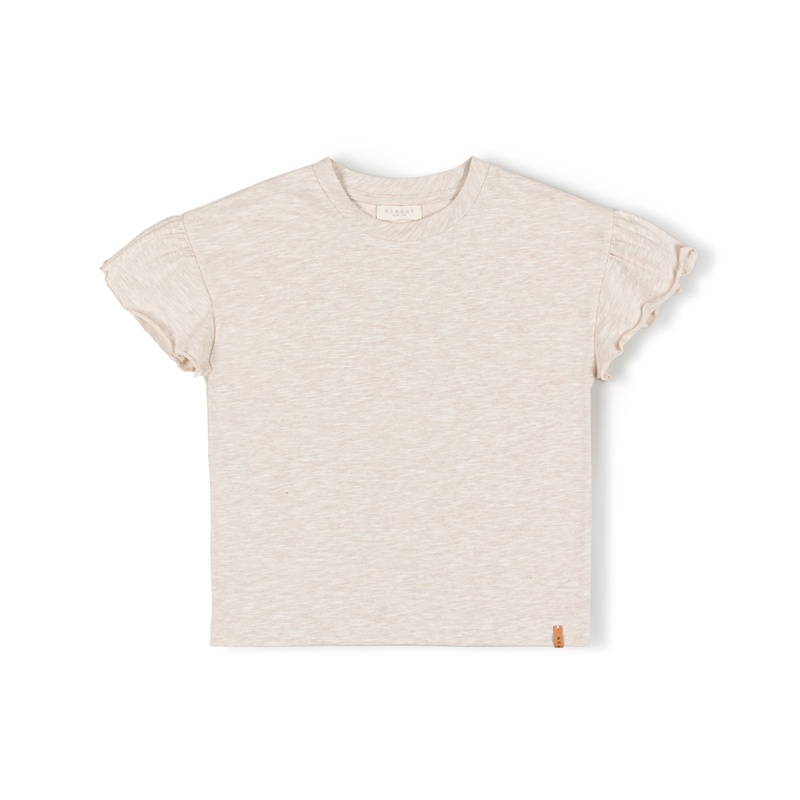 Deze zachte en stijlvolle top met speelse ruffle mouwtjes is dé ultieme basic voor meisjes! Gemaakt van 100% duurzaam en ademend katoen, biedt het een heerlijk comfortabele pasvorm. De gemêleerde beige tint geeft een verfijnde en tijdloze uitstraling, terwijl het subtiele leren Nixnut-label aan de onderkant zorgt voor een elegante finishing touch.