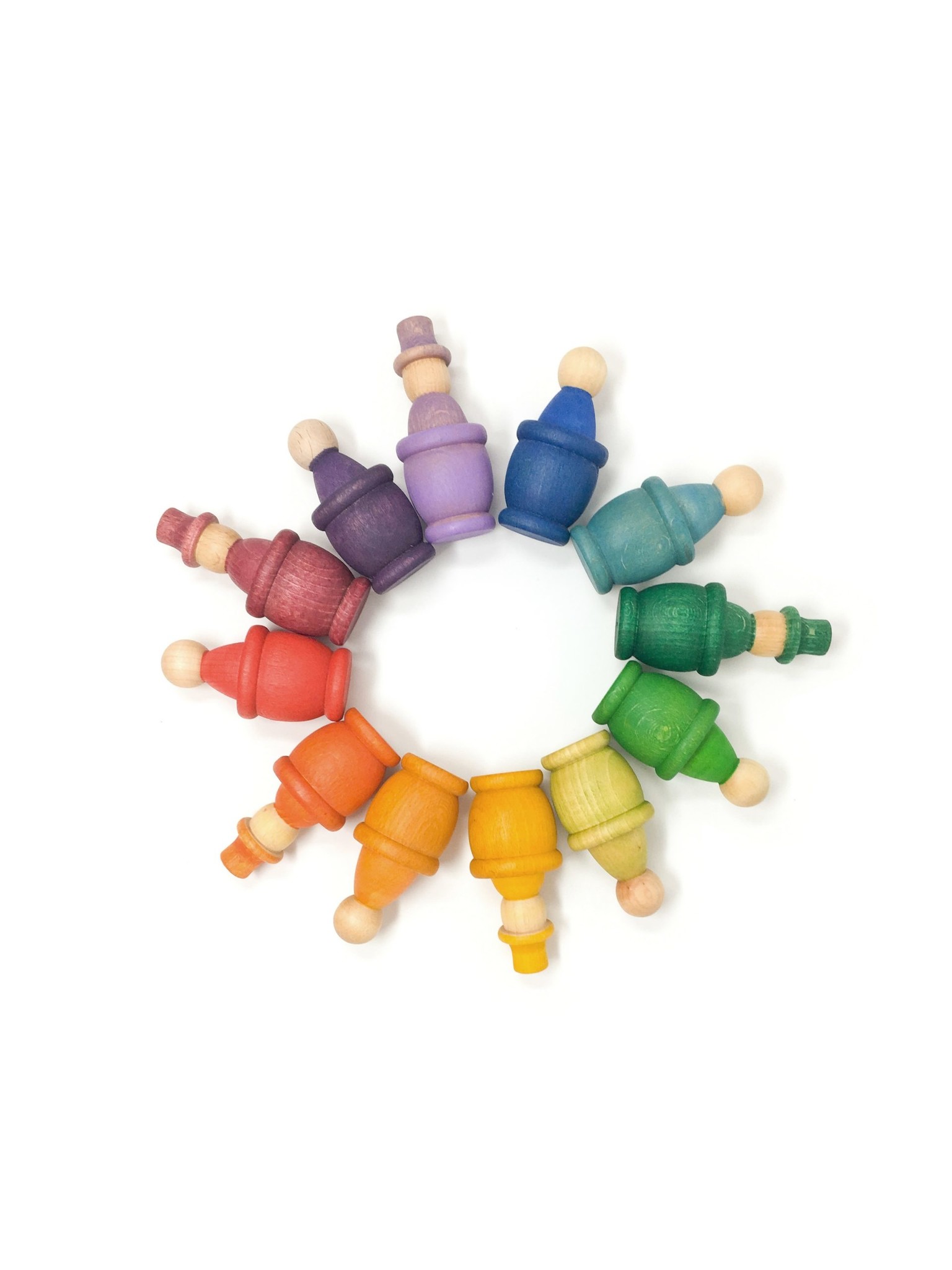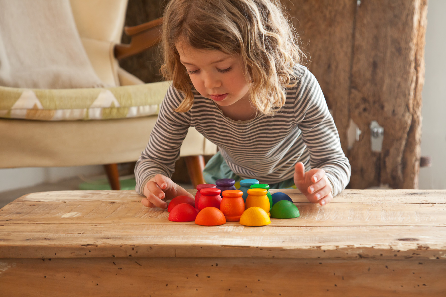 The 12 “mates” painted with 12 different colours of the rainbow, can be a perfect complement of the Ref. 15-109, to match, classify, sort, pile up. Unde ned forms favor divergent thinking in all its forms, giving the possibility to the child to make their own crea- tions. Can be a perfect element for Small Worlds and openended play.