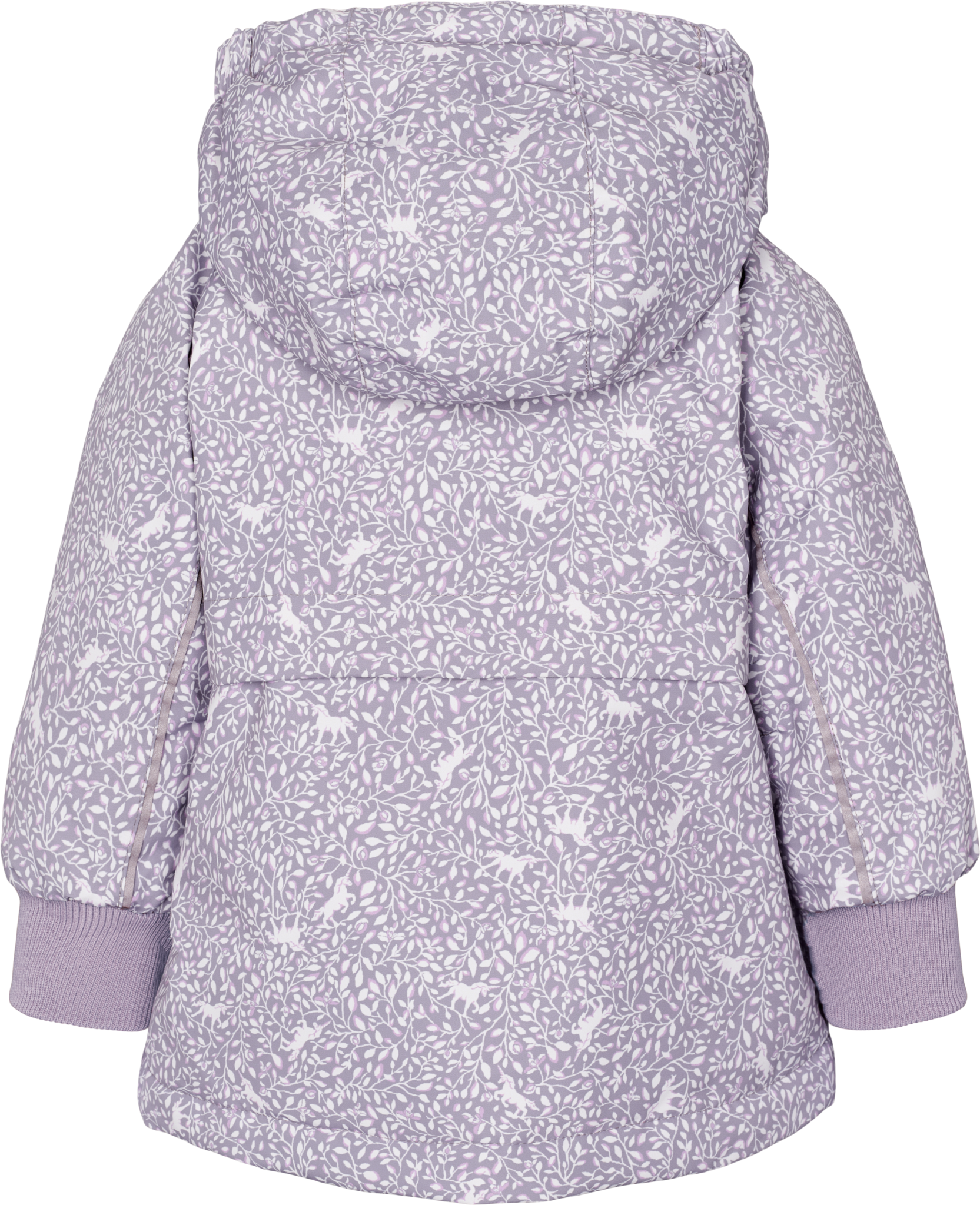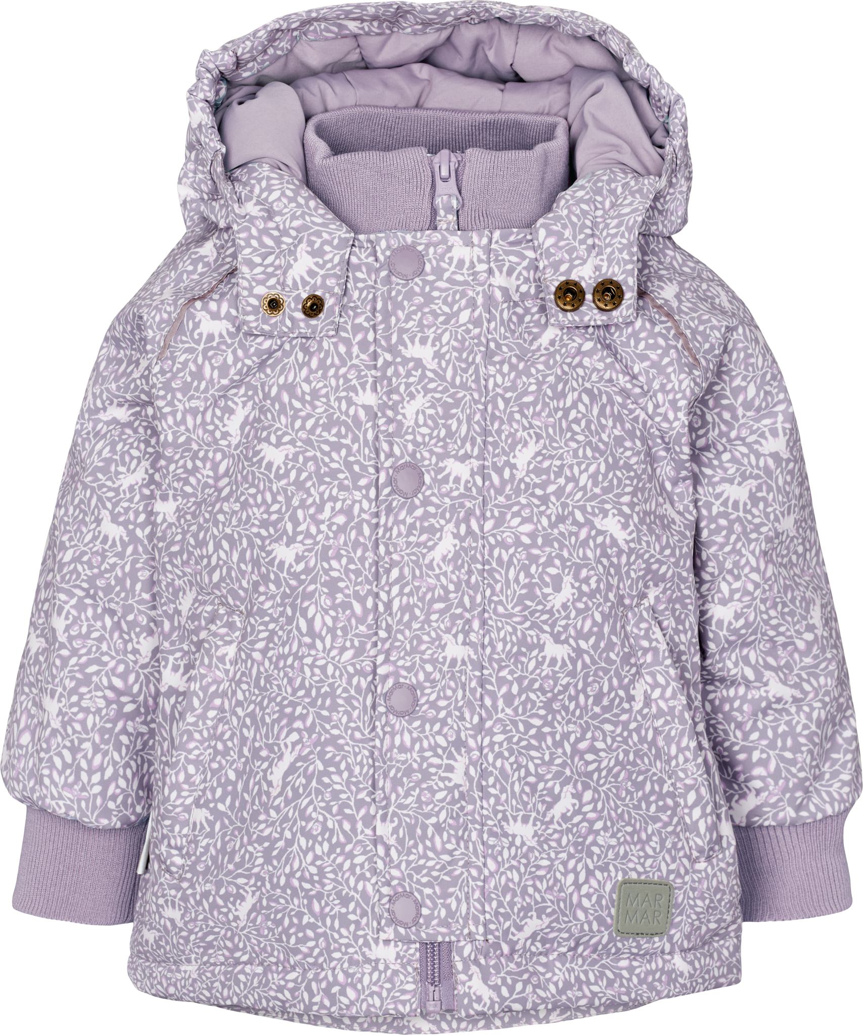 Winterjas van Marmar Copenhagen in een zachte lila kleur met een eenhoornprint.