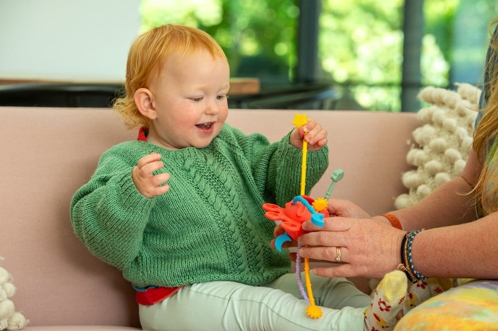 De TickiT Silisoft® Zip Trek (Regenboog) is een veelzijdig sensorisch fidget-speelgoed dat meerdere zintuigen prikkelt — perfect voor nieuwsgierige kleine handjes. Trek de kleurrijke, geribbelde tentakels door de centrale hub voor een rustgevend ritselend geluid. Elke tentakel heeft een unieke kleur, vorm en patroon, wat tactiele verkenning stimuleert. De buitenkant is uitgerust met knoppen die een bevredigend klikgeluid maken bij het indrukken, ideaal voor kalmerend friemelen of stressverlichting. Gemaakt van veilig, voedselveilig silicone voor een zachte, duurzame en veilige speelervaring. Met zijn mix van visuele, auditieve en tactiele stimulatie biedt het speelgoed eindeloos leerzaam en ontspannend plezier.