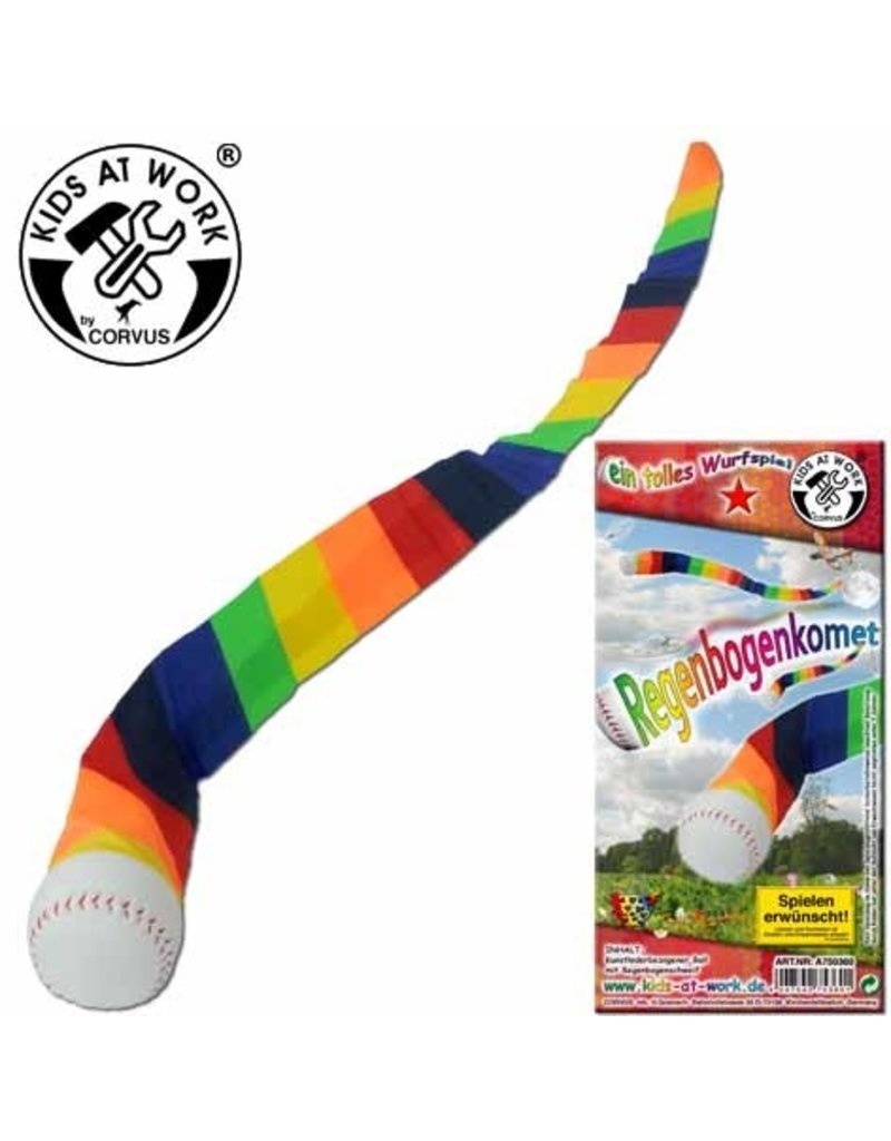 Deze werpbal met een vrolijke staart in regenboogkleuren zorgt voor uren speelplezier.